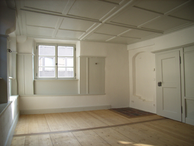 Insbesondere die Stube ist noch reich ausgestattet mit historischen Wandvertäfelungen, Kassettendecke etc. Die historischen Bauteile wurden behutsam restauratorisch überarbeitet und partiell ergänzt.
