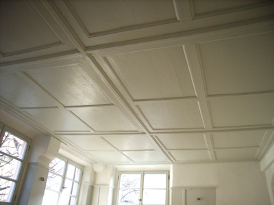 Die Kassettendecke war durch Auflasten aus der Deckenkonstruktion stark verformt. Sie wurde in weiten Teilen abgenommen, holzrestauratorisch überarbeitet und nach Instandsetzung der Deckenkonstruktion an alter Stelle wieder eingebaut.