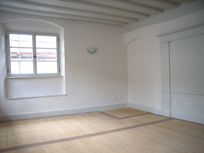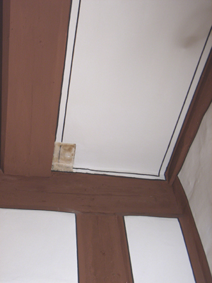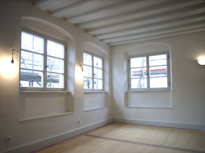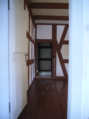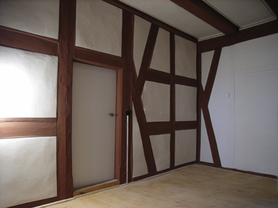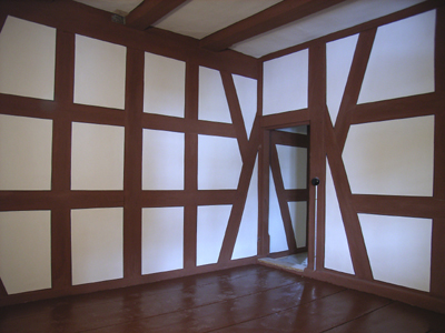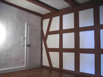 Im 2.Obergeschoss sind die Wandstellungen aus der Aufstockung des Gebäudes im 16. Jahrhundert nahezu unverändert erhalten. Hier, in der Wohnung des Bauherren, konnten die historischen Raumschalen in weiten Teilen wieder hergestellt und die zugehörigen Farbgestaltungen wieder aufgenommen werden.