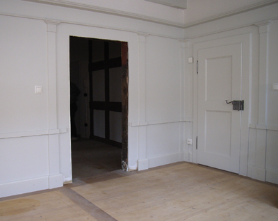 Die verloren gegangene Wandvertäfelung wurde, nach Vorbild der Wandvertäfelung im 1. OG, in stark vereinfachter Form neu eingebaut.