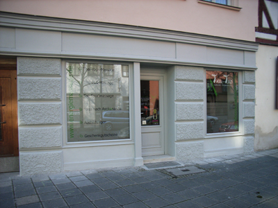 Die ehemaligen hölzernen Einfassungen der Schaufenster wurden in Anlehnung an die frühere Gestaltung, jedoch in vereinfachten Formen wieder hergestellt.