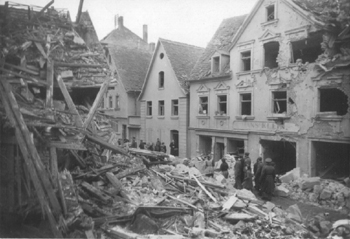 Die historische Aufnahme zeigt das Haus inmitten der stark zerstörten Nachbargebäude.
